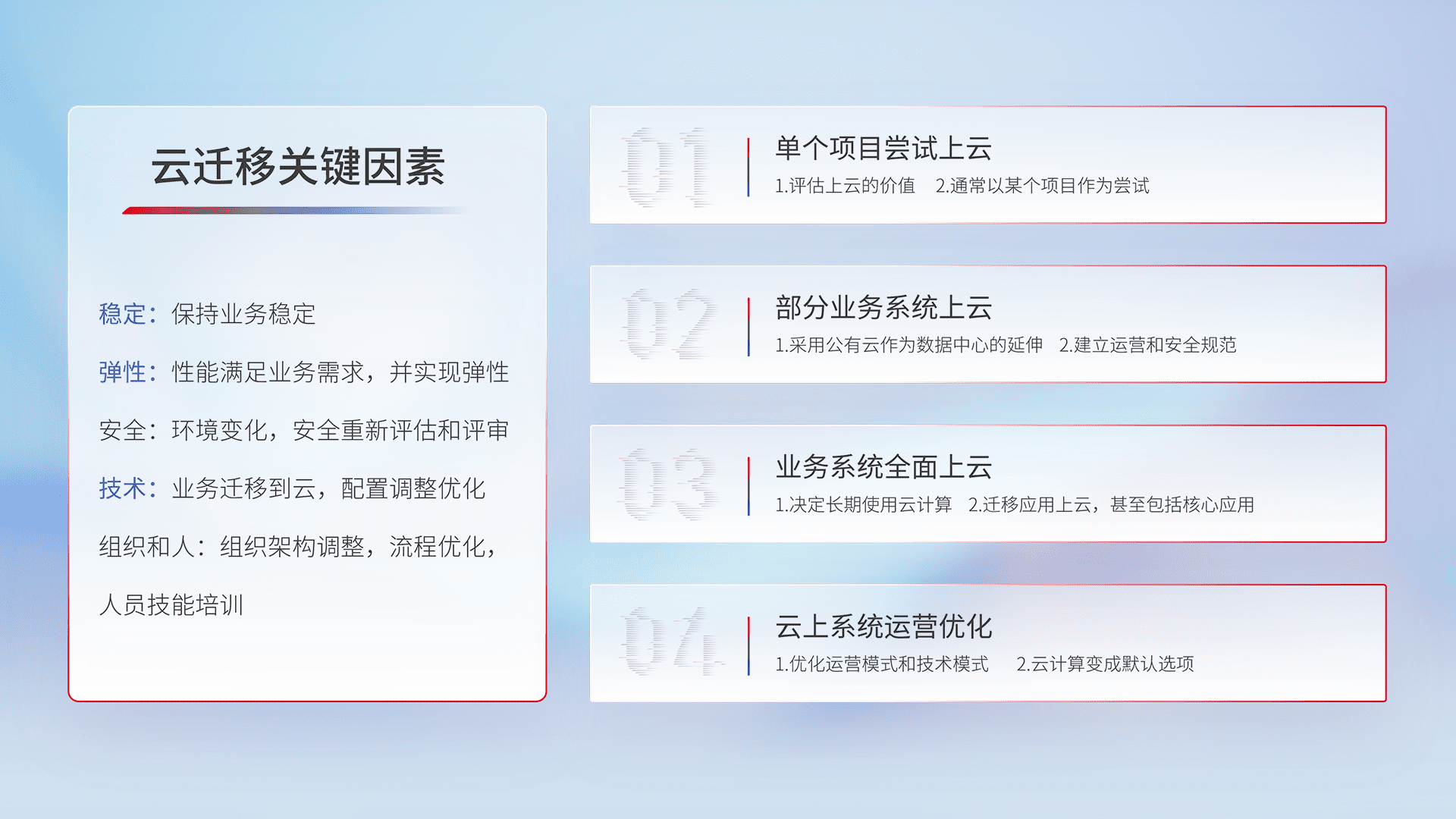 结合实际业务,,,,从规划设计、、、云平台选型、、、、云原生改造、、、、数据迁移、、集成交付,,,,迁移全过程为客户识别最佳上云路径,,做好风险识别管理,,,,设计网络架构、、、身份权限、、安全审计合规、、操作审计、、、日志审计、、、监控告警策略、、多站点容灾设计等,,对云上基础设施进行整体规划,,,,提升IT治理水平,,,,以满足弹性、、、、高可用、、高性能的需求。。