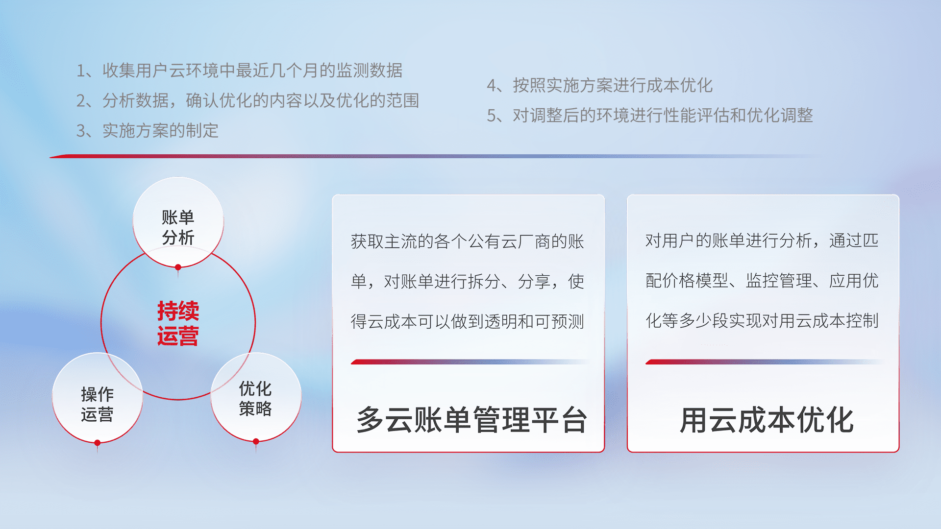 通过多云纳管,,以统一的资源数据模型把客户的云资源进行抽象和封装,,,进而实现对多云资源的统一操作,,,,保障云资源管理的可靠性、、、、稳定性与可用性。。。量身定制化运维内容,,配置、、、开发运维、、、、补丁管理、、、备份、、、、监控、、、认证和访问管理、、审计和日常巡检等,,,保障在用云过程中的可靠度,,稳定度以及高可用率。。